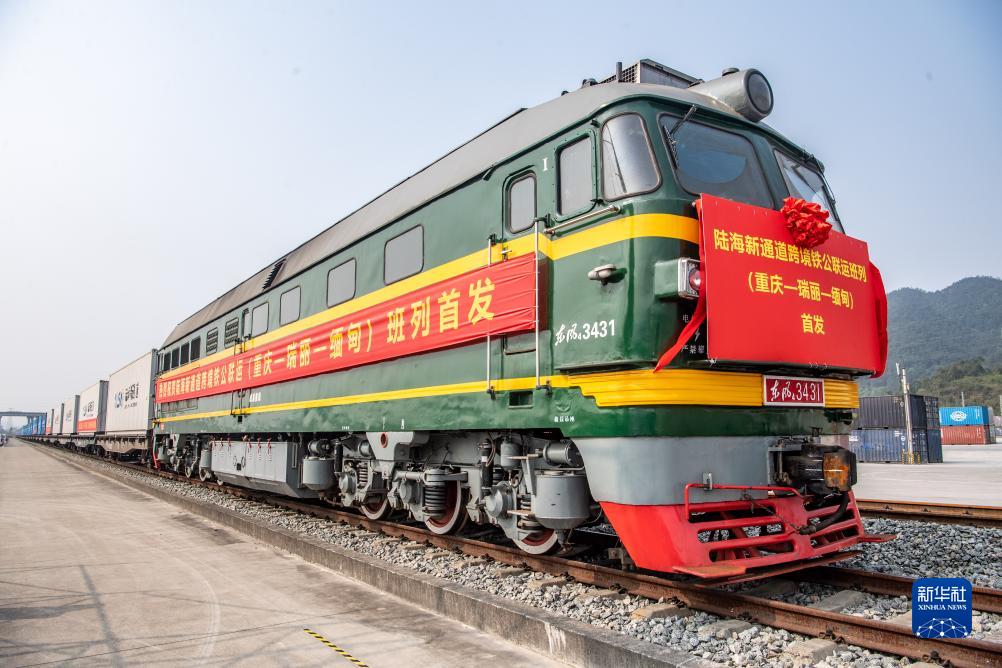 陸海新通道跨境鐵公聯(lián)運班列(重慶—瑞麗—緬甸)首發(fā)班列在重慶江津小南埡鐵路物流中心等候發(fā)車(2023年4月3日攝)。