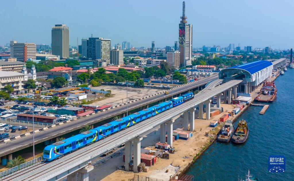 這是2022年12月21日在尼日利亞拉各斯拍攝的輕軌藍線上的一列輕軌列車(無人機照片)。由中國土木工程集團有限公司承建的拉各斯輕軌藍線項目一期是西非第一條由中國企業自主設計、建造、施工、運營的電氣化城市輕軌交通項目。