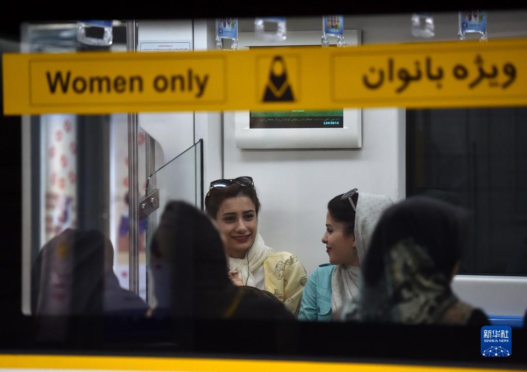 2016年9月4日,幾名女性乘客在伊朗德黑蘭乘坐地鐵。伊朗首都德黑蘭5條地鐵線全部由中國公司承建,其中德黑蘭地鐵1、2號線由中信國際承建,3、4、5號線由北方國際承建;地鐵車輛由中伊合資的德黑蘭軌道車輛制造公司(由中國的北方國際合作股份有限公司、中國中車長春軌道客車股份有限公司和伊朗綠菠蘿工業集團在伊朗合資成立)提供。