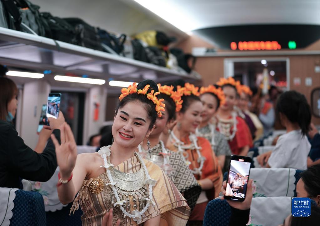 2023年4月13日,老撾工作人員在D887次國際旅客列車上表演。北起中國昆明,南至老撾萬象,全長1035公里的中老鐵路跨越山河,促進了中老兩國以及共建“一帶一路”國家間的經貿合作和文化交流,成為聯通內外、輻射周邊、雙向互濟的黃金大通道。