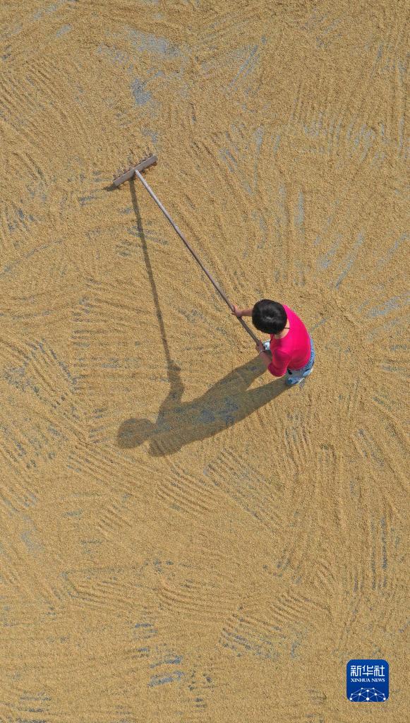 金秋時節,農民忙著收獲晾曬,豐收圖景美如畫。