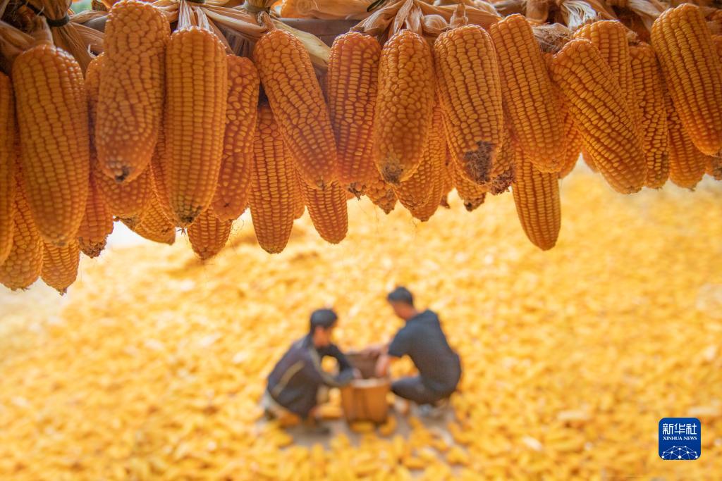10月12日,云南省文山壯族苗族自治州文山市追栗街鎮的農民晾曬收獲的玉米。