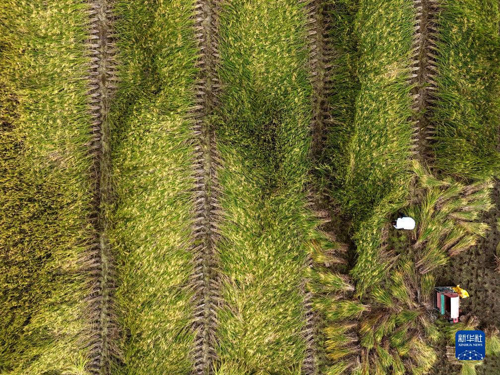 10月12日,農戶在浙江省樂清市白石街道密川村田間收割稻谷(無人機照片)。