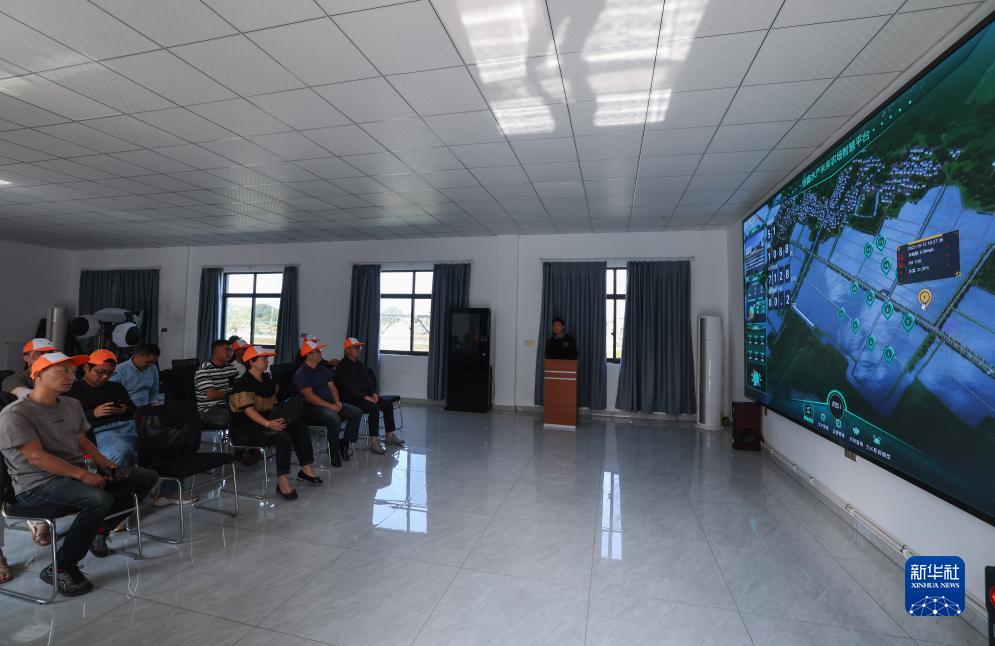 10月12日,在蟹臨門太湖蟹共富養殖基地內,工作人員給前來學習養殖經驗的外地養殖戶介紹基地的情況。