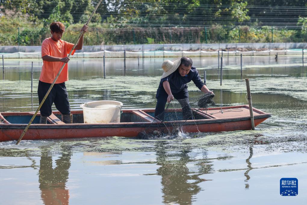 10月12日,蟹臨門太湖蟹共富養殖基地的蟹農在養殖基地內捕撈太湖蟹。