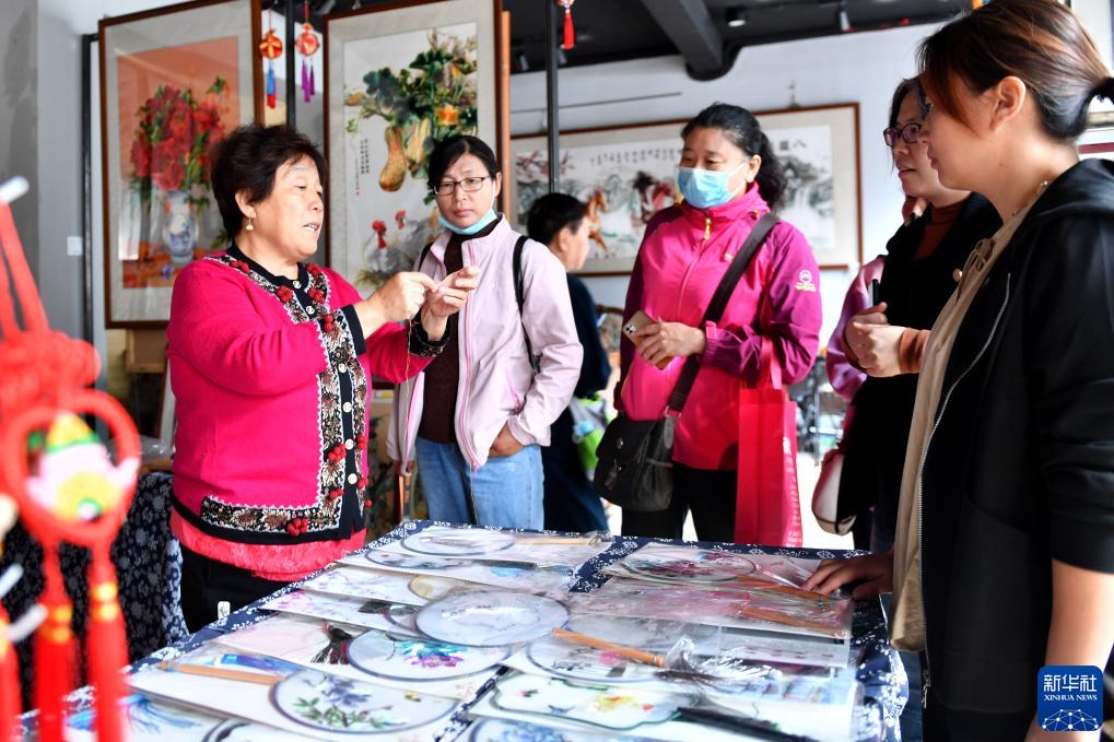 10月12日,在石家莊市鹿泉區(qū)土門關(guān)驛道小鎮(zhèn),河北省級(jí)非遺傳承人邢蘭芳(左一)向游客介紹邢氏刺繡工藝。