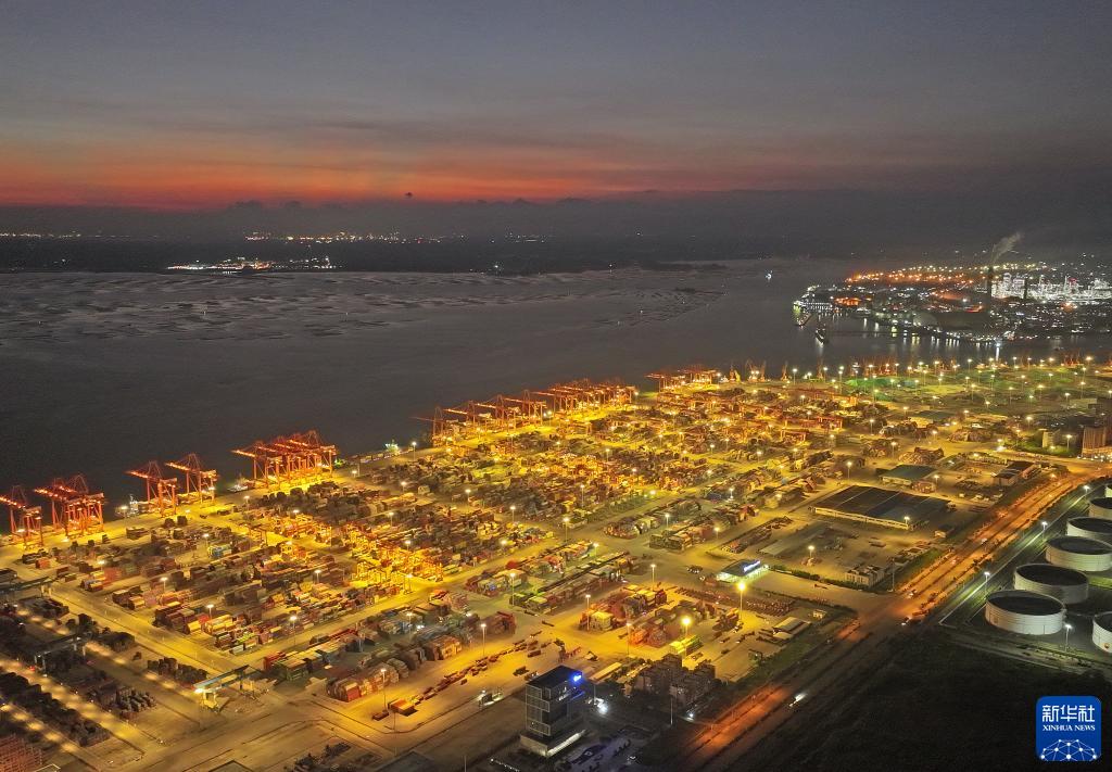 10月3日拍攝的欽州港碼頭夜景(無人機照片)。