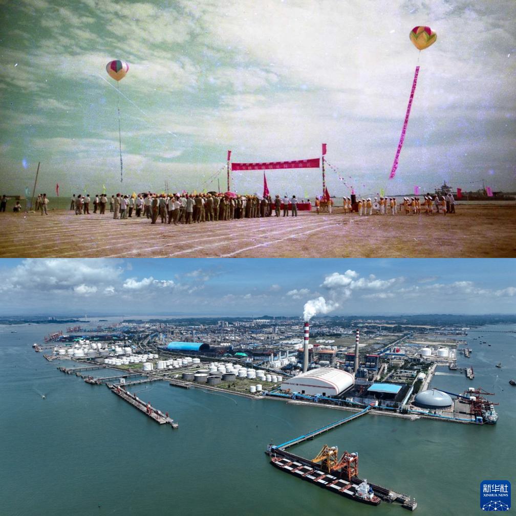 拼版照片:上圖為欽州港能源碼頭動(dòng)工建設(shè)場景(1997年7月24日攝);下圖為2022年8月28日拍攝的欽州港能源運(yùn)輸碼頭(無人機(jī)照片,新華社記者張愛林?jǐn)z)。