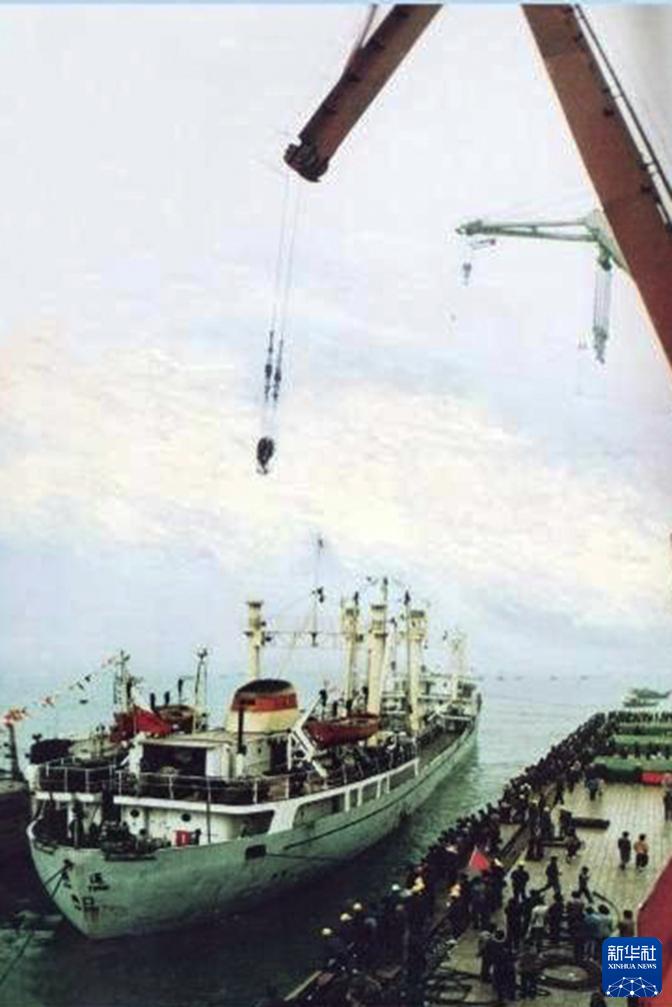 這是第一艘駛進欽州港卸貨的海輪(1994年1月16日攝)。
