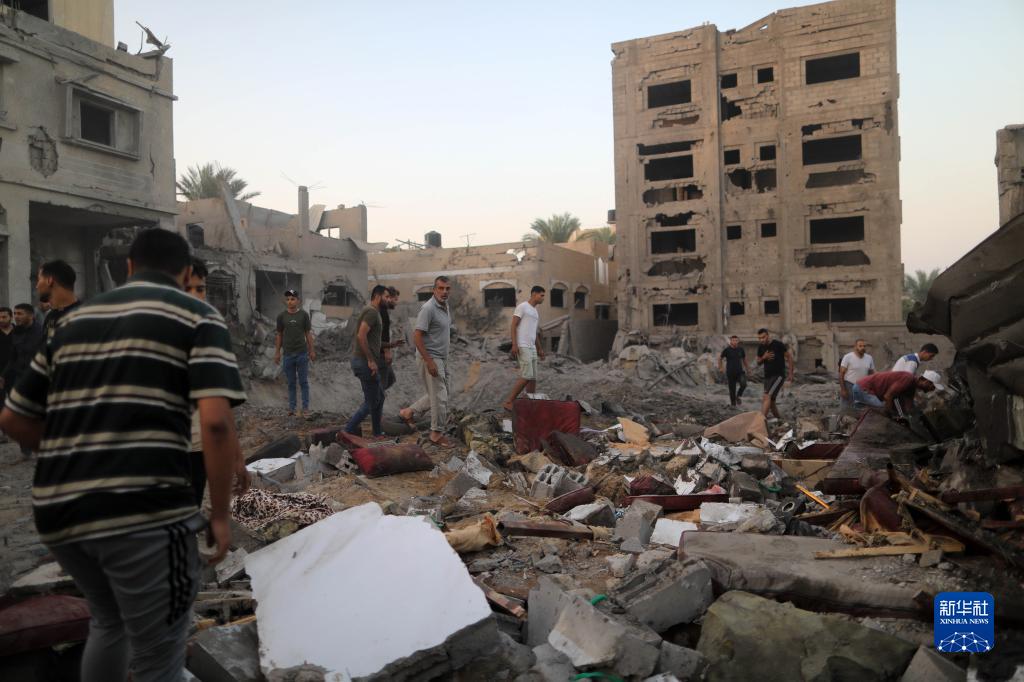 10月12日,在加沙地帶南部城市汗尤尼斯,人們查看遭以色列空襲后的建筑。