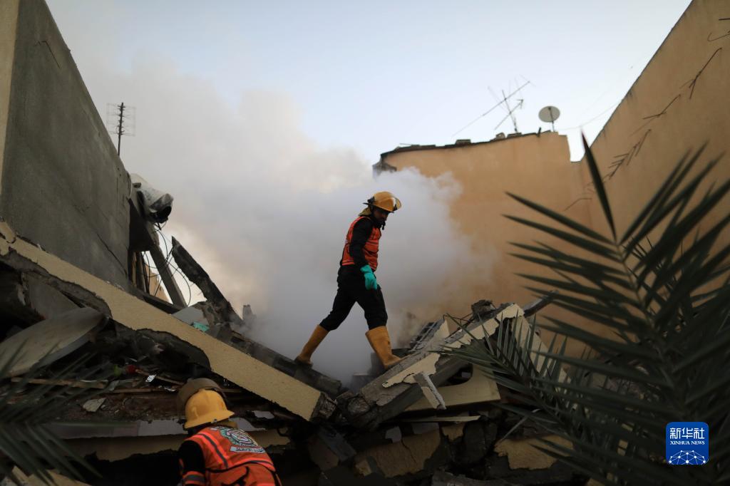 10月12日,在加沙地帶南部城市汗尤尼斯,巴勒斯坦民防人員給遭以色列空襲的建筑滅火。