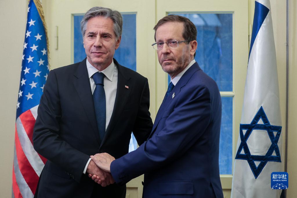 10月12日,訪問以色列的美國國務卿布林肯(左)在特拉維夫與以色列總統赫爾佐格會晤后共同會見記者。