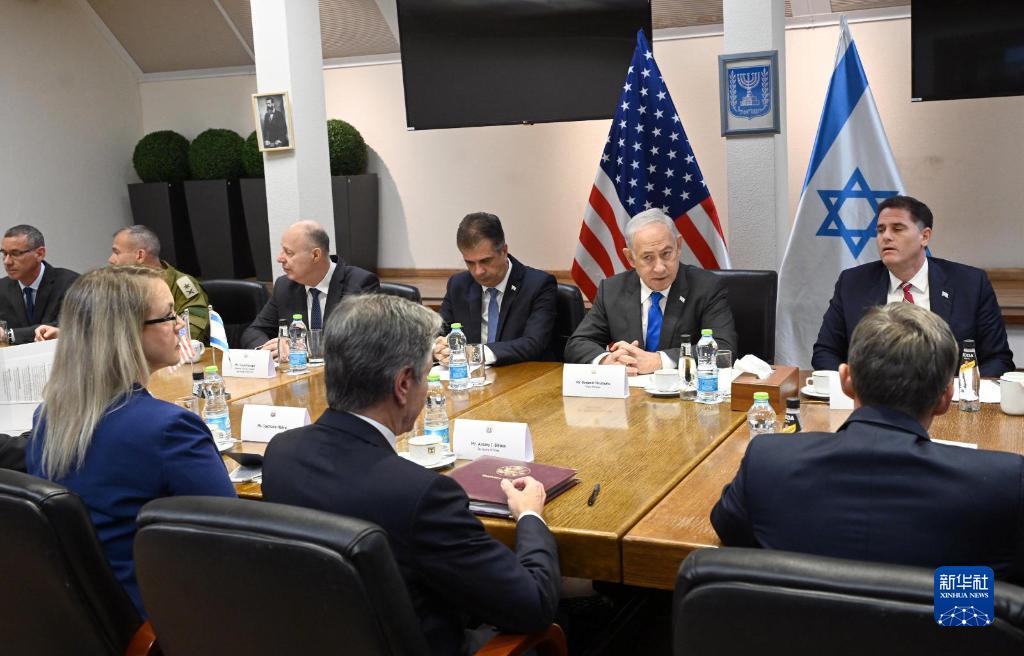 10月12日,訪問以色列的美國國務卿布林肯(前,中)在特拉維夫與以色列總理內塔尼亞胡舉行會晤。