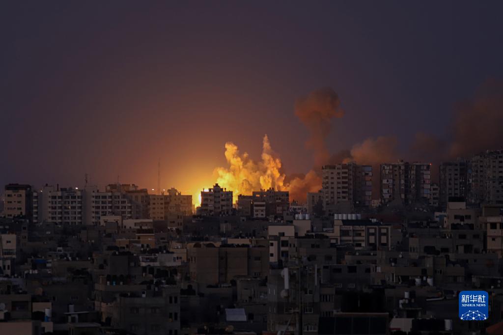 這是10月12日在加沙城拍攝的以色列軍隊空襲產生的火光。