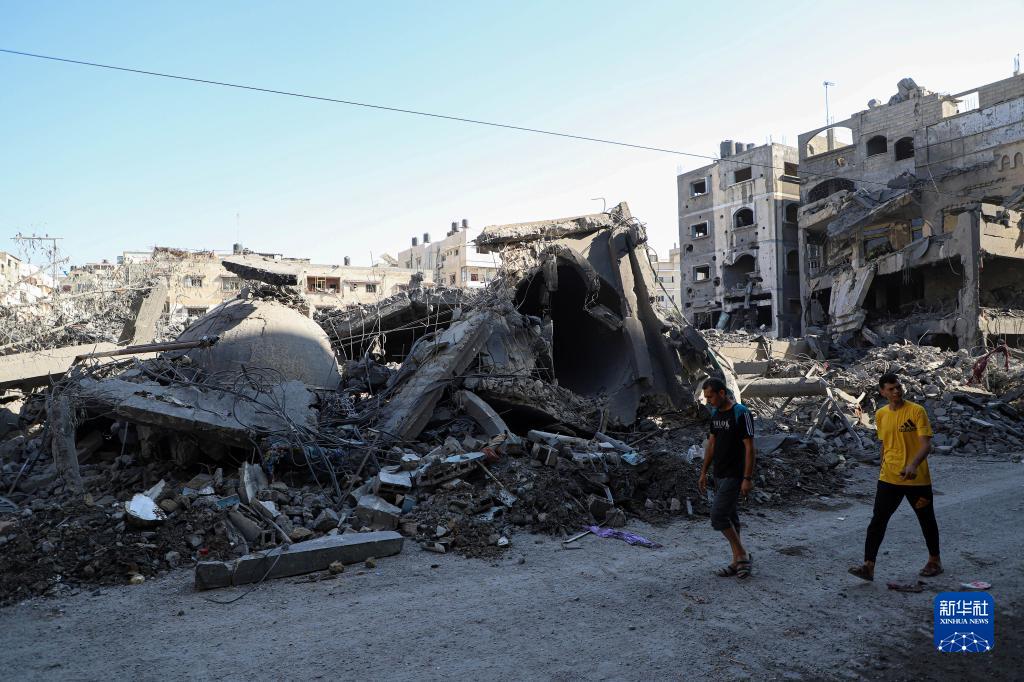 10月12日,在加沙城,人們走過被以色列軍隊空襲炸毀的建筑。