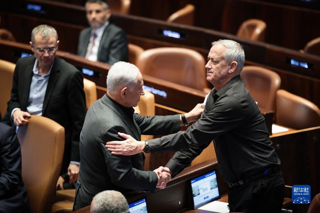 10月12日,在耶路撒冷,以色列總理內塔尼亞胡(左)與前國防部長甘茨出席特別會議時握手。
