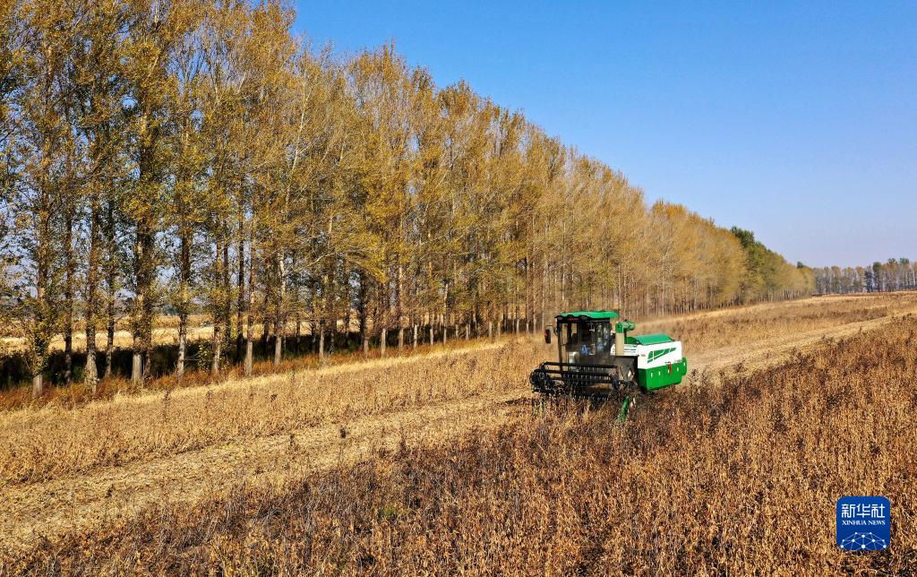 10月12日,收割機械在昌圖縣亮中橋鎮亮中村的大豆田里作業(無人機照片)。
