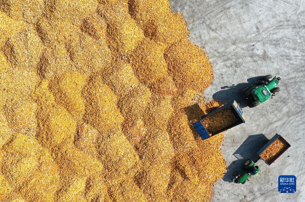 10月12日,裝運拖拉機在昌圖縣亮中橋鎮(zhèn)永豐村的糧場內卸下剛剛收獲的玉米(無人機照片)。