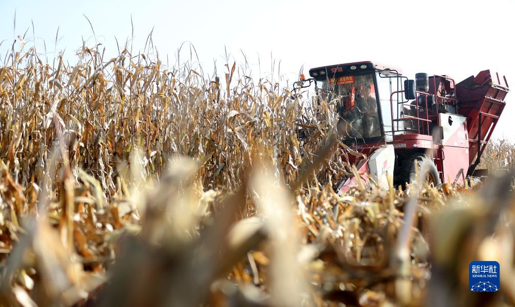 10月12日,收割機械在昌圖縣亮中橋鎮永豐村的玉米田里作業。