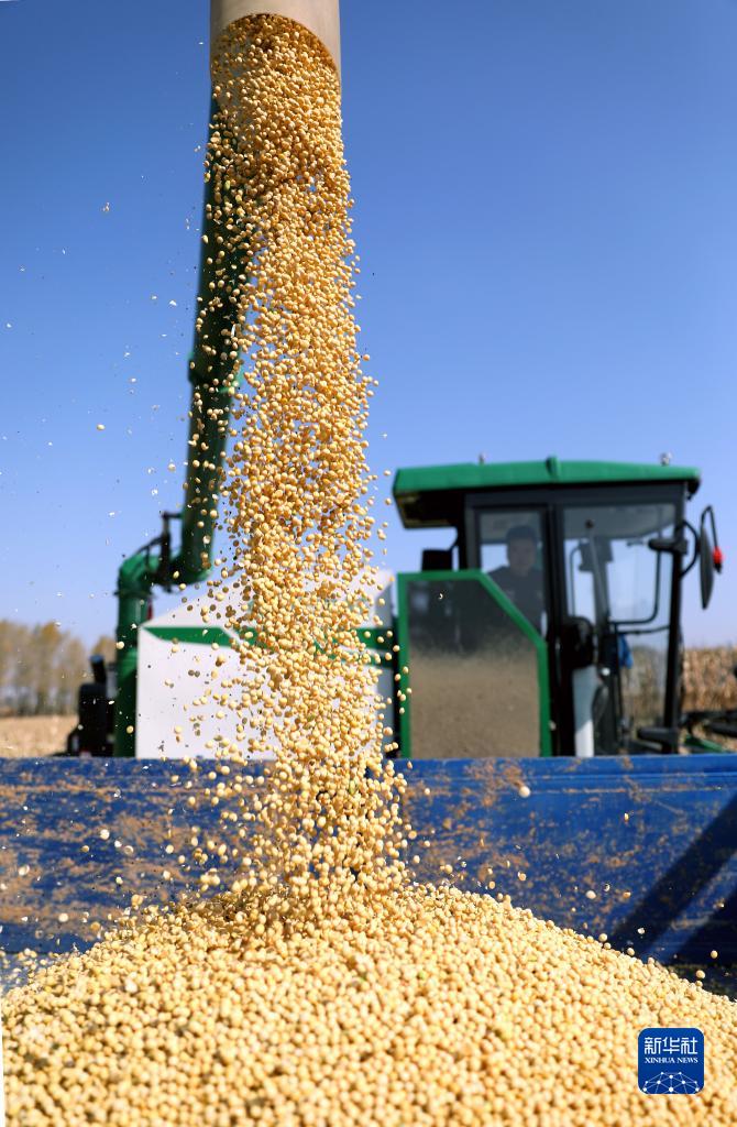 10月12日,農(nóng)機(jī)在昌圖縣亮中橋鎮(zhèn)亮中村的大豆田里裝運(yùn)剛剛收獲的大豆。
