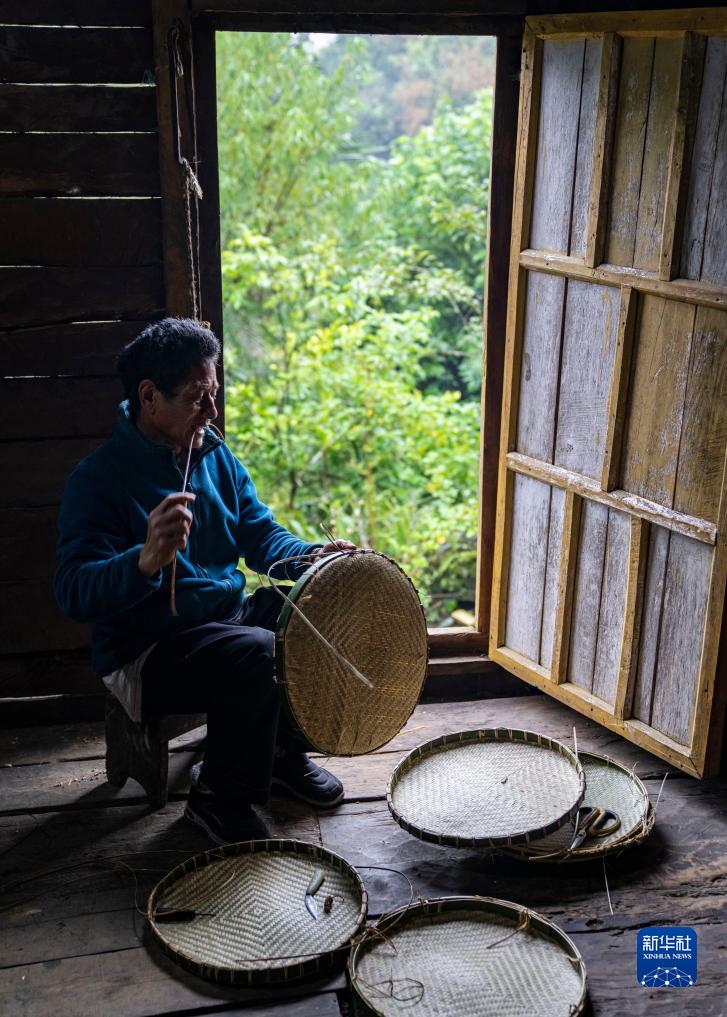 在西藏墨脫縣背崩鄉巴登村,一名村民在編織竹筐(10月11日攝)。