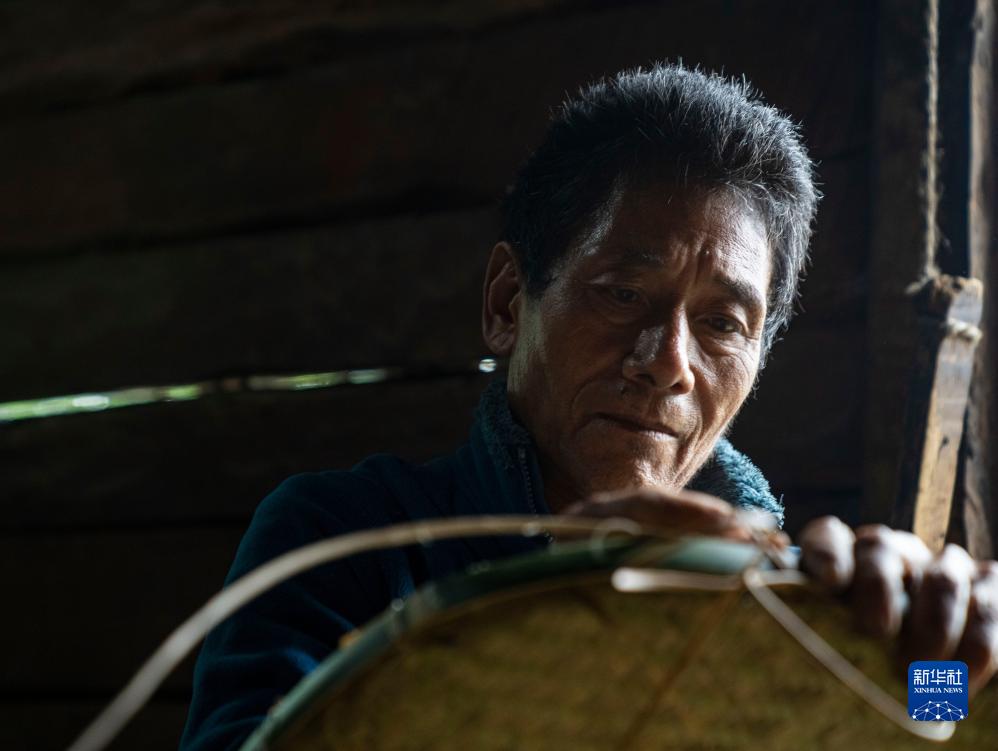 在西藏墨脫縣背崩鄉(xiāng)巴登村,一名村民在編織竹筐(10月11日攝)。