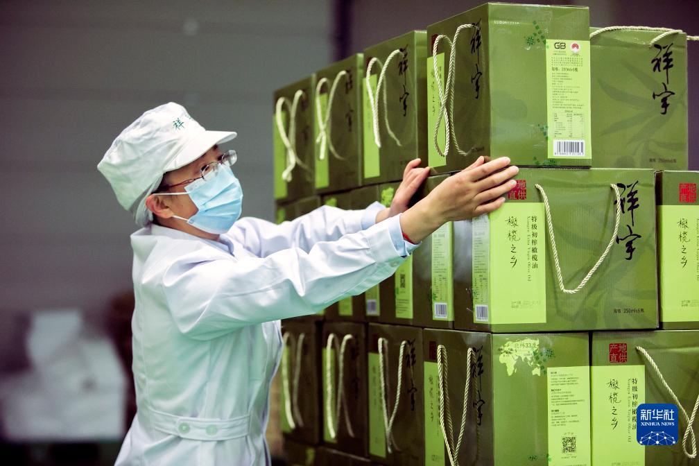 10月11日,在隴南市武都區(qū)一家油橄欖加工企業(yè)生產(chǎn)線上,工作人員將包裝好的橄欖油碼放整齊。