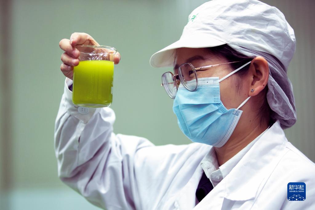 10月11日,隴南市武都區一家油橄欖加工企業的工作人員在觀察初榨橄欖油品質。