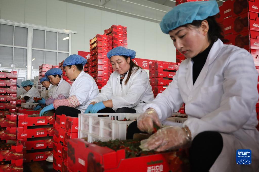 近日,在甘肅省平涼市崆峒區四十里鋪鎮的智能玻璃溫室里,采用基質吊架立體栽培系統等技術培育的串收番茄陸續成熟,務工人員忙著收獲、打包,準備進行銷售。近年來,平涼市著力發展設施蔬菜產業鏈,不僅為市場提供了高品質產品,還幫助群眾實現就近就業。