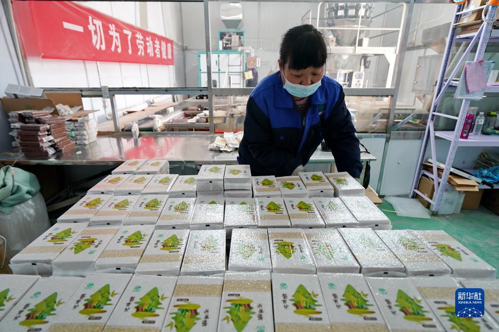 10月12日,河北省沽源縣一家藜麥加工企業的工人在整理包裝好的藜麥。