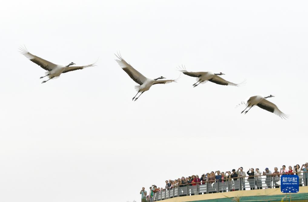 10月12日,一群丹頂鶴在東營黃河三角洲濕地飛翔。