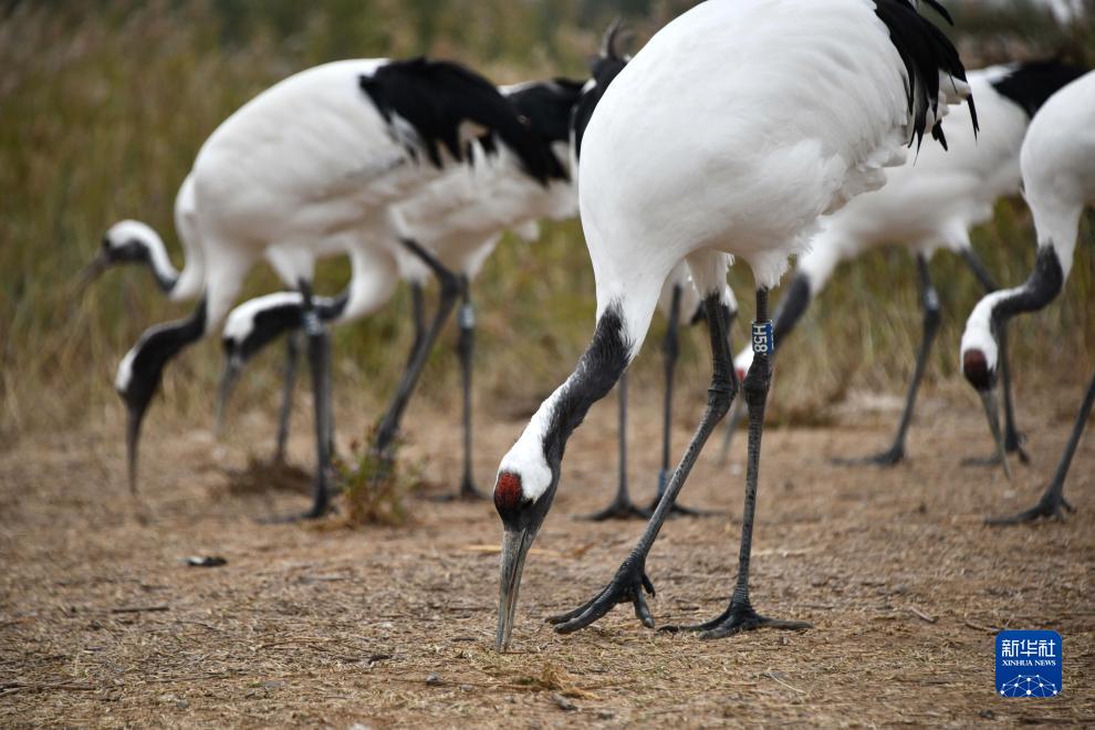 一群丹頂鶴在東營黃河三角洲濕地棲息(10月12日攝)。