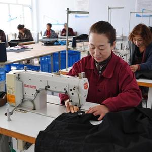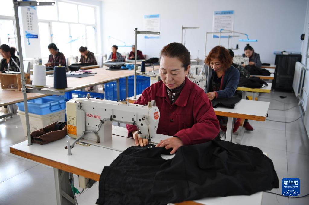 10月11日,河北省康保縣張紀鎮(zhèn)柴家村一家服裝加工企業(yè)的工人在縫制服裝。