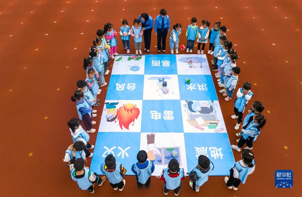 10月13日,檢察干警在江蘇省泰州市姜堰區(qū)顧高幼兒園通過“擲沙包”游戲給小朋友介紹各類災(zāi)害事故應(yīng)對方式(無人機(jī)照片)。