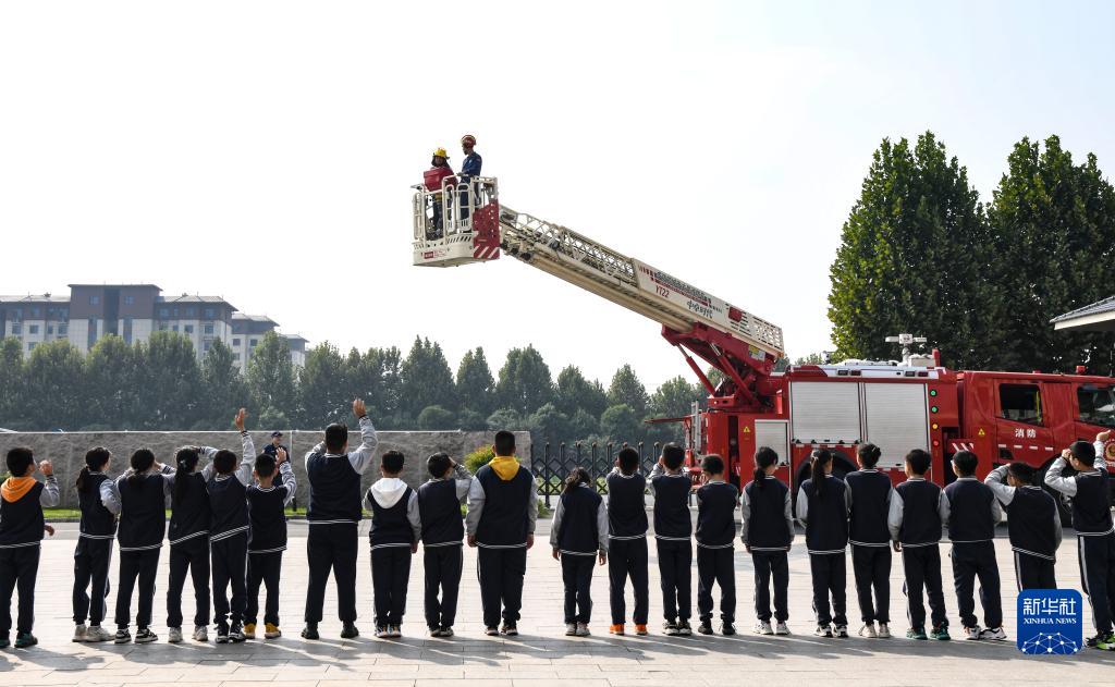 10月13日,在河南省濟(jì)源市延慶外國(guó)語(yǔ)學(xué)校,一名學(xué)生在消防員陪伴下乘云梯體驗(yàn)高空救援。