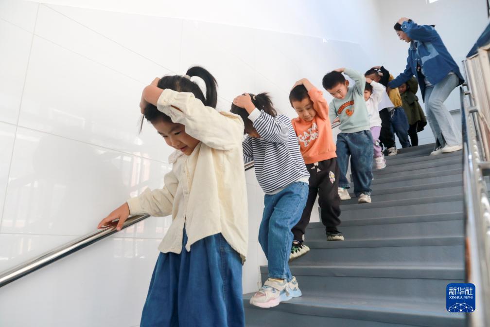 10月13日,山東省高密市鳳鳴實驗幼兒園的教師組織孩子們進(jìn)行防震逃生演練。