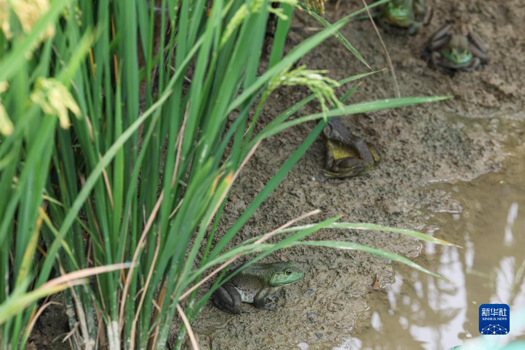 這是10月13日在杭州臨安太陽鎮(zhèn)的杭州佳稷農(nóng)業(yè)生態(tài)稻米種植基地拍攝的稻田里套養(yǎng)的牛蛙,套養(yǎng)能讓每畝增收2000至3000元。