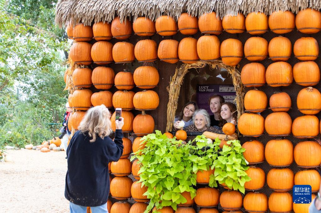 10月12日,在美國得克薩斯州達拉斯植物園的“南瓜小鎮(zhèn)”,游客在一個南瓜小屋內(nèi)合影。