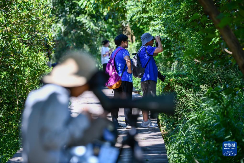 10月13日,市民在深圳福田紅樹林濕地觀察候鳥。