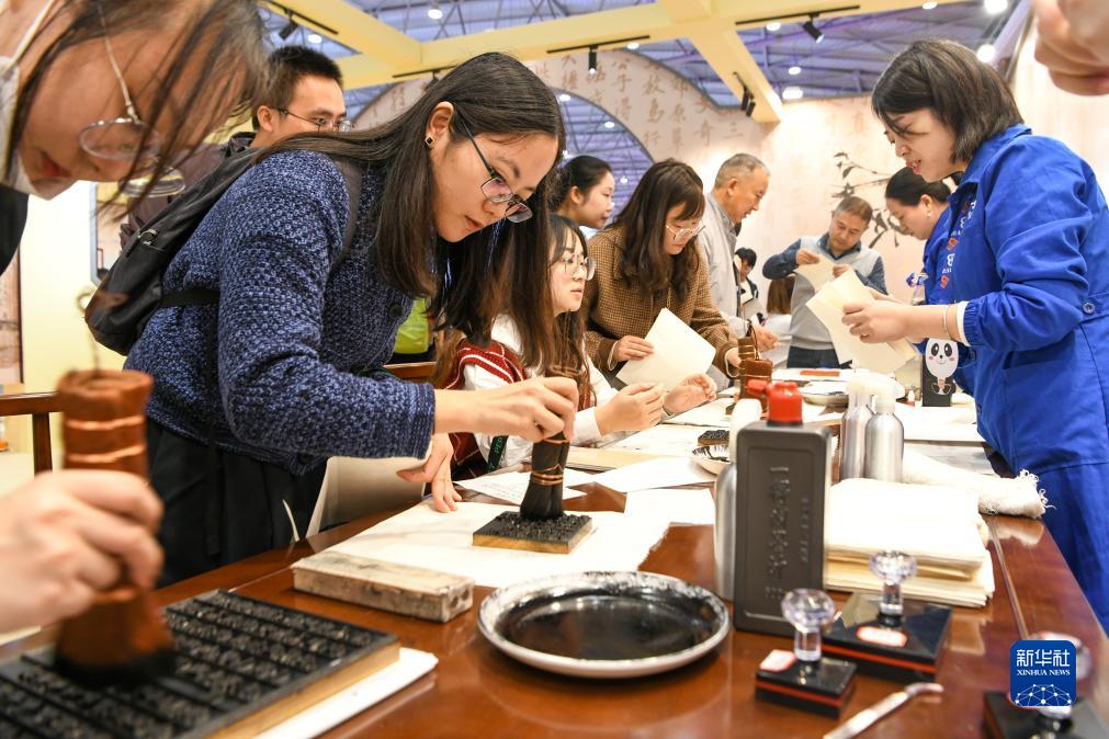 10月13日,在位于成都市世紀城新國際會展中心的2023天府書展主展場,市民在體驗印刷技藝。