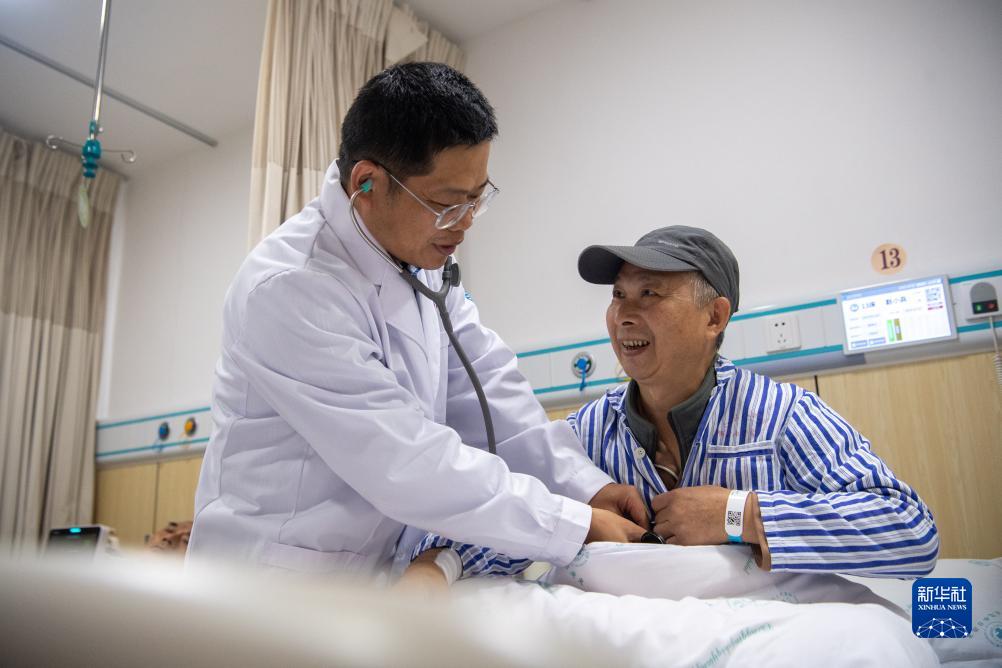 10月12日,在江蘇省人民醫(yī)院重慶醫(yī)院過渡病房內,醫(yī)護人員和病人交流。重慶綦江區(qū)近年來加大醫(yī)療投入和改革,引入江蘇省人民醫(yī)院優(yōu)質醫(yī)療資源,截至今年上半年已成功開展心血管相關手術1200例。目前,江蘇省人民醫(yī)院重慶醫(yī)院正在火熱建設中,規(guī)劃床位1000張。