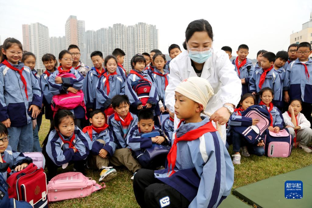 10月13日,在江蘇省連云港市院前小學(xué),醫(yī)護(hù)人員為學(xué)生講解急救常識(shí)。