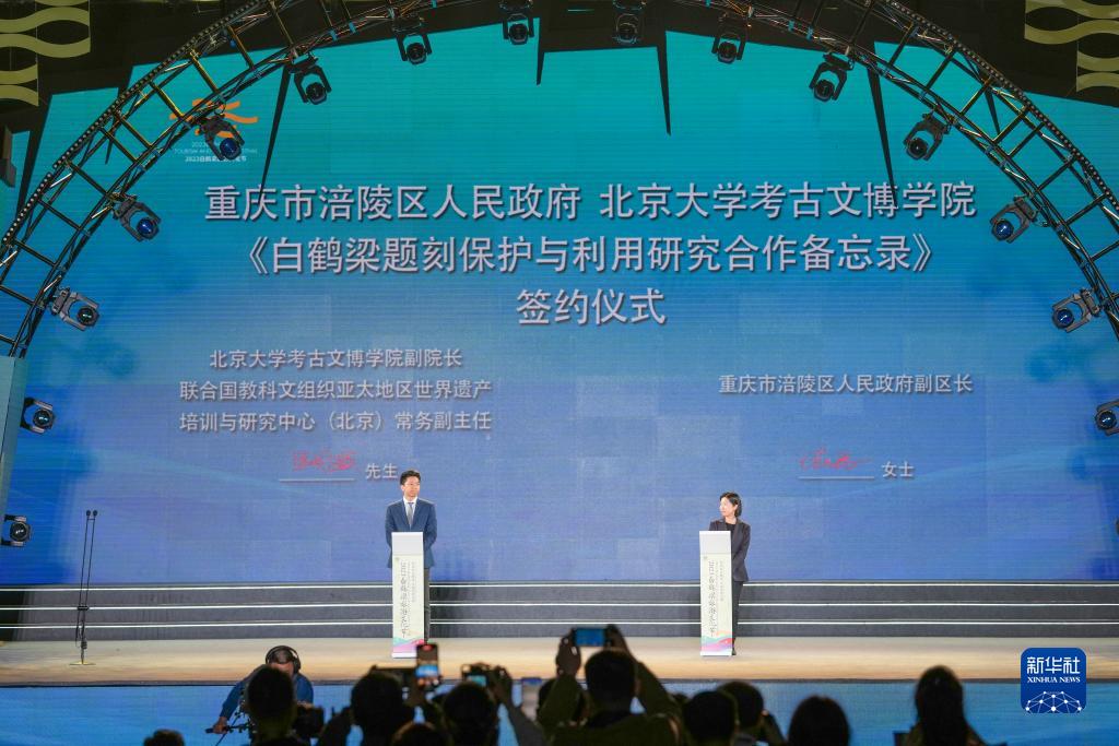 這是10月13日在重慶涪陵舉辦的2023白鶴梁旅游文化節開幕式上拍攝的《白鶴梁題刻保護與利用研究合作備忘錄》簽約儀式現場。