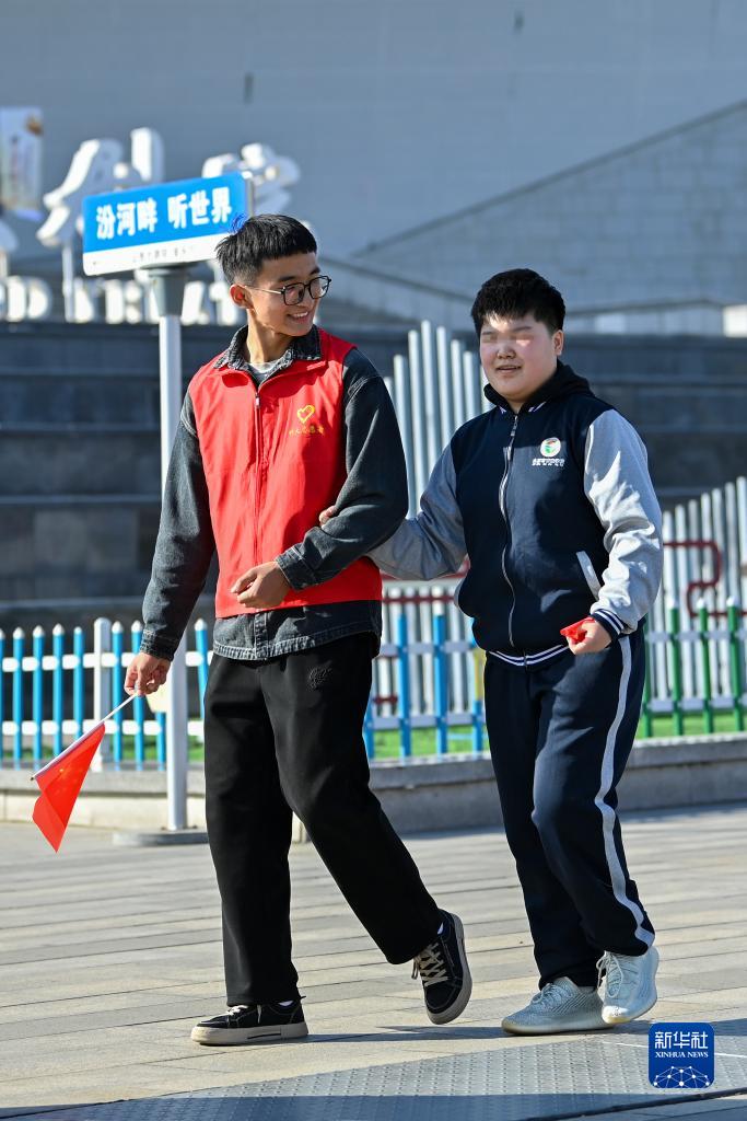 10月13日,志愿者和盲校學生在太原汾河公園交流。