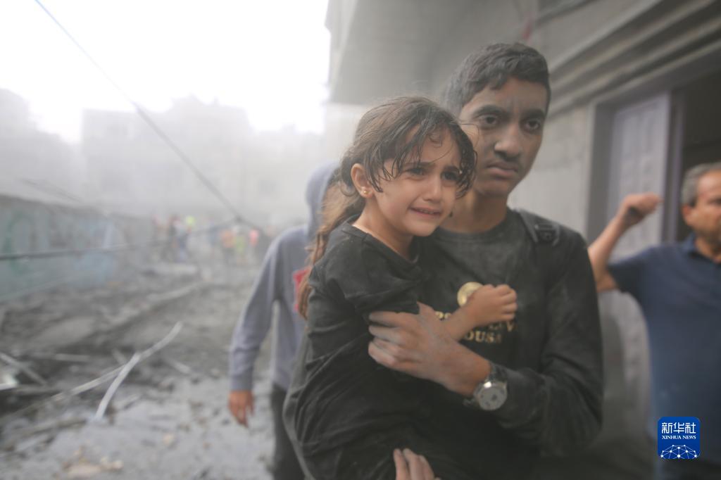 10月12日,在加沙地帶南部城市拉法,一名男子抱著小女孩走在遭以色列空襲的受損建筑中。