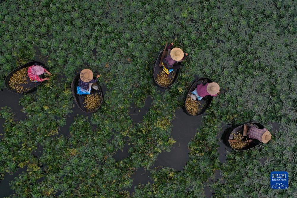 近日,浙江省湖州市南潯區和孚鎮多個鄉村種植的菱角進入收獲季。村民劃著菱桶在水面采菱,展現一幅江南水鄉獨有的豐收圖景。
