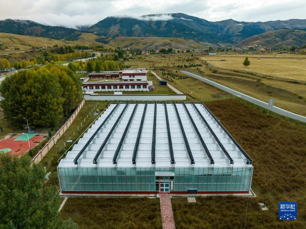 這是10月13日在理塘縣瑪吉阿米花園農莊拍攝的智慧農業無土栽培館(無人機照片)。