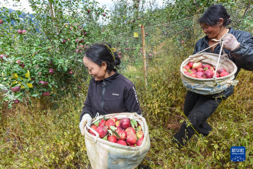 10月13日,在鄉城縣“蘋果+藏豬”種養循環現代農業園區內的有機蘋果種植示范基地,當地藏族群眾太(左)和洛絨抱著采摘的蘋果下山。