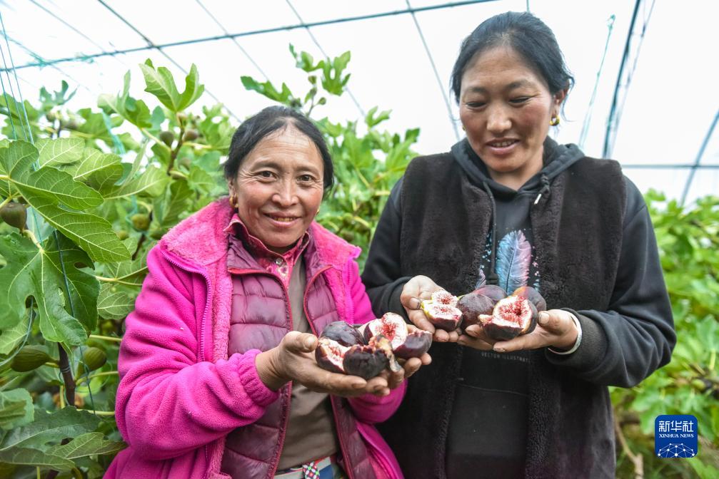 10月13日,在理塘縣瑪吉阿米花園農莊的高原蔬菜大棚里,當地藏族群眾志瑪澤仁(左)和所珍展示采摘的無花果。