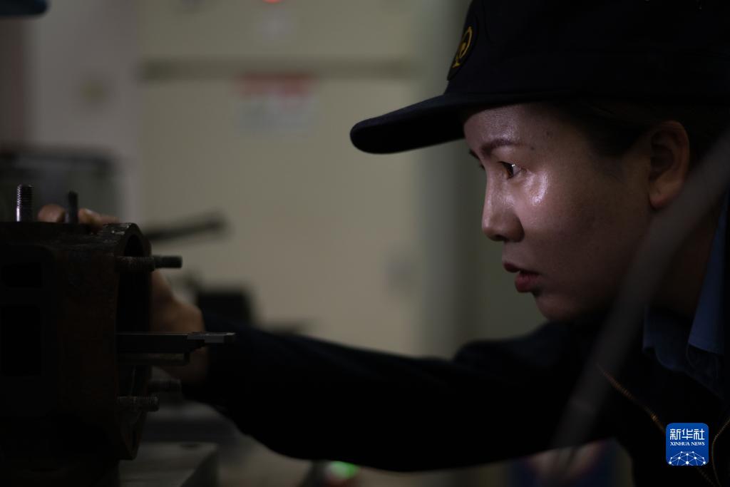 10月12日,在中國鐵路青藏集團有限公司西寧東車輛段制動班組,馬婷檢查120閥主閥內腔。